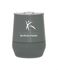 12 oz double wall 18/8 stainless steel thermal tumbler with copper vacuum insulation, push-on lid, matching swivel closure, and removable silicone base.