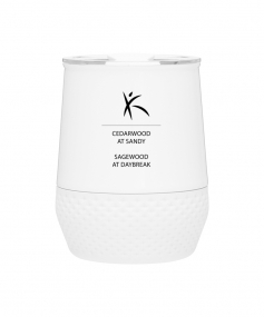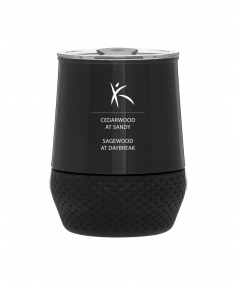 12 oz double wall 18/8 stainless steel thermal tumbler with copper vacuum insulation, push-on lid, matching swivel closure, and removable silicone base.