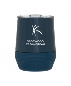 12 oz double wall 18/8 stainless steel thermal tumbler with copper vacuum insulation, push-on lid, matching swivel closure, and removable silicone base.