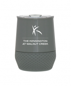 12 oz double wall 18/8 stainless steel thermal tumbler with copper vacuum insulation, push-on lid, matching swivel closure, and removable silicone base.