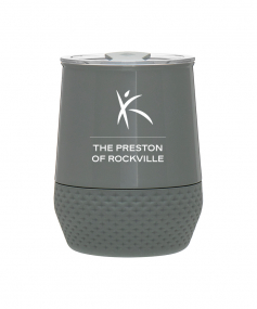 12 oz double wall 18/8 stainless steel thermal tumbler with copper vacuum insulation, push-on lid, matching swivel closure, and removable silicone base.