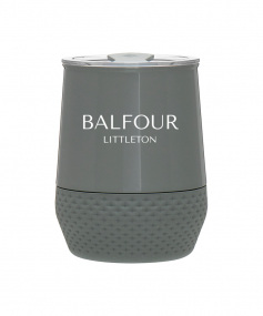 12 oz double wall 18/8 stainless steel thermal tumbler with copper vacuum insulation, push-on lid, matching swivel closure, and removable silicone base.
