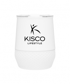 12 oz double wall 18/8 stainless steel thermal tumbler with copper vacuum insulation, push-on lid, matching swivel closure, and removable silicone base.