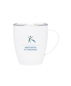12 oz double wall 18/8 stainless steel thermal mug with copper vacuum insulation, clear acrylic push-on lid, and matching swivel; Hand wash recommended; Do not microwave; 4-7/16" h x 4"w (4-7/8 with handle) ; 355mL.