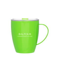 12 oz double wall 18/8 stainless steel thermal mug with copper vacuum insulation, clear acrylic push-on lid, and matching swivel; Hand wash recommended; Do not microwave; 4-7/16" h x 4"w (4-7/8 with handle) ; 355mL.