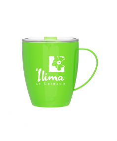 12 oz double wall 18/8 stainless steel thermal mug with copper vacuum insulation, clear acrylic push-on lid, and matching swivel; Hand wash recommended; Do not microwave; 4-7/16" h x 4"w (4-7/8 with handle) ; 355mL.