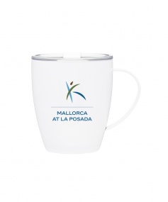 12 oz double wall 18/8 stainless steel thermal mug with copper vacuum insulation, clear acrylic push-on lid, and matching swivel; Hand wash recommended; Do not microwave; 4-7/16" h x 4"w (4-7/8 with handle) ; 355mL.