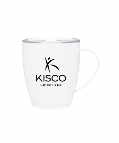 12 oz double wall 18/8 stainless steel thermal mug with copper vacuum insulation, clear acrylic push-on lid, and matching swivel; Hand wash recommended; Do not microwave; 4-7/16" h x 4"w (4-7/8 with handle) ; 355mL.