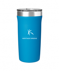18 oz double wall 18/8 stainless steel thermal tumbler with vacuum insulation, brushed stainless steel rim, clear push-on acrylic lid with sliding closure, and powder coated finish. Hand wash recommended. Do not microwave. Complies with FDA, Prop 65. 7.25" H x 3.5" W