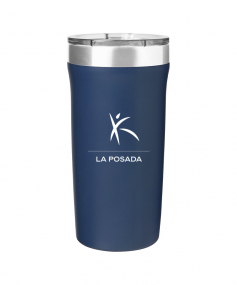 18 oz double wall 18/8 stainless steel thermal tumbler with vacuum insulation, brushed stainless steel rim, clear push-on acrylic lid with sliding closure, and powder coated finish. Hand wash recommended. Do not microwave. Complies with FDA, Prop 65. 7.25" H x 3.5" W