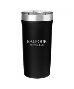 18 oz double wall 18/8 stainless steel thermal tumbler with vacuum insulation, brushed stainless steel rim, clear push-on acrylic lid with sliding closure, and powder coated finish. Hand wash recommended. Do not microwave. Complies with FDA, Prop 65. 7.25" H x 3.5" W