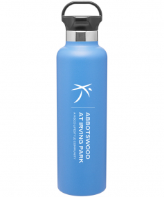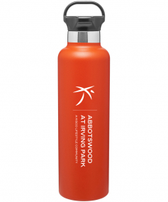 24 oz powder coated double wall 18/8 stainless steel thermal bottle with copper vacuum insulation, threaded gear-shaped insulated lid and carrying handle Complies with FDA, Prop 65. 11.25" H x 3" W