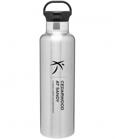 24 oz powder coated double wall 18/8 stainless steel thermal bottle with copper vacuum insulation, threaded gear-shaped insulated lid and carrying handle Complies with FDA, Prop 65. 11.25" H x 3" W