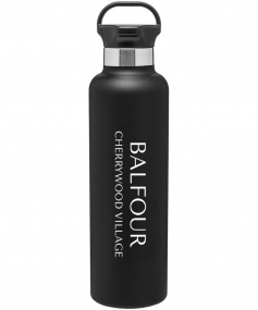 24 oz powder coated double wall 18/8 stainless steel thermal bottle with copper vacuum insulation, threaded gear-shaped insulated lid and carrying handle Complies with FDA, Prop 65. 11.25" H x 3" W