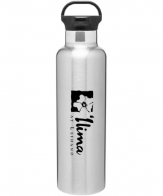 24 oz powder coated double wall 18/8 stainless steel thermal bottle with copper vacuum insulation, threaded gear-shaped insulated lid and carrying handle Complies with FDA, Prop 65. 11.25" H x 3" W