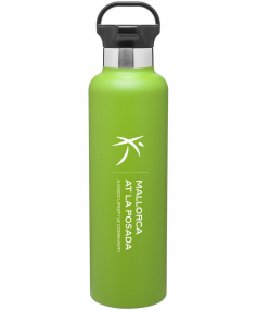 24 oz powder coated double wall 18/8 stainless steel thermal bottle with copper vacuum insulation, threaded gear-shaped insulated lid and carrying handle Complies with FDA, Prop 65. 11.25" H x 3" W