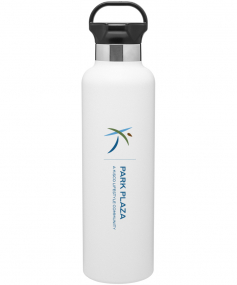 24 oz powder coated double wall 18/8 stainless steel thermal bottle with copper vacuum insulation, threaded gear-shaped insulated lid and carrying handle Complies with FDA, Prop 65. 11.25" H x 3" W