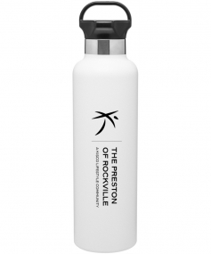 24 oz powder coated double wall 18/8 stainless steel thermal bottle with copper vacuum insulation, threaded gear-shaped insulated lid and carrying handle Complies with FDA, Prop 65. 11.25" H x 3" W