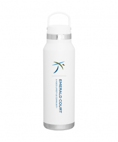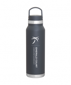 25 oz double wall 18/8 stainless steel thermal bottle with copper vacuum insulation, threaded insulated lid with carrying handle, high polish accent, stainless steel base, and powder coated finish. Hand wash recommended; Do not microwave. Dimensions: 10 H x 3".