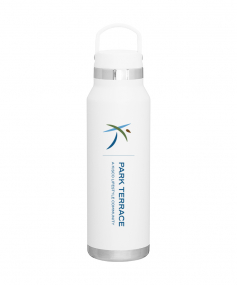 25 oz double wall 18/8 stainless steel thermal bottle with copper vacuum insulation, threaded insulated lid with carrying handle, high polish accent, stainless steel base, and powder coated finish. Hand wash recommended; Do not microwave. Dimensions: 10 H x 3".