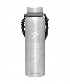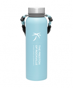 32 oz double wall 18/8 stainless steel thermal bottle with copper vacuum insulation, insulated stainless steel threaded lid, silicone ring, removable strap with buckles, removable clasps, and powder coated finish. Individual gift box. Hand wash recommended. Do not microwave. Complies with FDA, Prop 65. 11" H x 3.1875" W