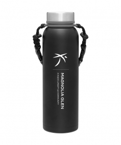 32 oz double wall 18/8 stainless steel thermal bottle with copper vacuum insulation, insulated stainless steel threaded lid, silicone ring, removable strap with buckles, removable clasps, and powder coated finish. Individual gift box. Hand wash recommended. Do not microwave. Complies with FDA, Prop 65. 11" H x 3.1875" W