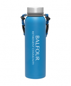 32 oz double wall 18/8 stainless steel thermal bottle with copper vacuum insulation, insulated stainless steel threaded lid, silicone ring, removable strap with buckles, removable clasps, and powder coated finish. Individual gift box. Hand wash recommended. Do not microwave. Complies with FDA, Prop 65. 11" H x 3.1875" W