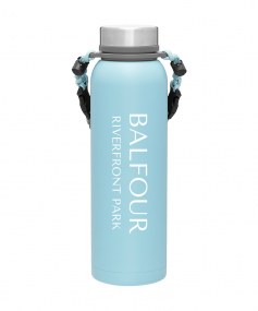 32 oz double wall 18/8 stainless steel thermal bottle with copper vacuum insulation, insulated stainless steel threaded lid, silicone ring, removable strap with buckles, removable clasps, and powder coated finish. Individual gift box. Hand wash recommended. Do not microwave. Complies with FDA, Prop 65. 11" H x 3.1875" W
