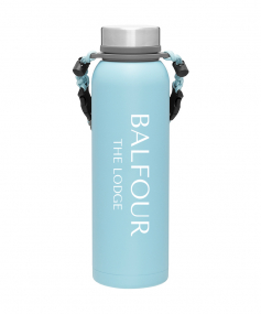 32 oz double wall 18/8 stainless steel thermal bottle with copper vacuum insulation, insulated stainless steel threaded lid, silicone ring, removable strap with buckles, removable clasps, and powder coated finish. Individual gift box. Hand wash recommended. Do not microwave. Complies with FDA, Prop 65. 11" H x 3.1875" W