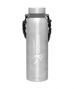 32 oz double wall 18/8 stainless steel thermal bottle with copper vacuum insulation, insulated stainless steel threaded lid, silicone ring, removable strap with buckles, removable clasps, and powder coated finish. Individual gift box. Hand wash recommended. Do not microwave. Complies with FDA, Prop 65. 11" H x 3.1875" W