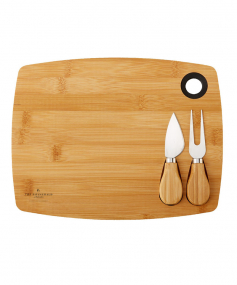 This 3 piece bamboo cheese board set includes: Bamboo Wood cutting board, Cheese Fork, and Spade (stays in place with a magnet). Features a silicone accent ring with naturally heat and bacteria resistant. It's eco friendly with 100% renewable resource. Best to hand wash with warm water and mild soap/detergent.Due to natural variations in the grain, laser engraved imprints may have slightly different shades. A tone on tone imprint is common with lasered bamboo. 11" H x 8 1/2" W x 1/2" D