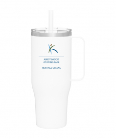 40 oz double wall 18/8 stainless steel thermal mug with copper vacuum insulation, stainless steel rim, dual-purpose push-on clear lid, matching sliding closure, flexible wide silicone straw, and powder coated finish. Individual gift box. Hand wash recommended. Do not microwave. Complies with FDA, Prop 65. 9.75" H x 4" W