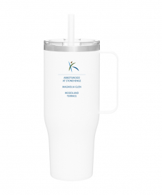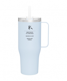 40 oz double wall 18/8 stainless steel thermal mug with copper vacuum insulation, stainless steel rim, dual-purpose push-on clear lid, matching sliding closure, flexible wide silicone straw, and powder coated finish. Individual gift box. Hand wash recommended. Do not microwave. Complies with FDA, Prop 65. 9.75" H x 4" W