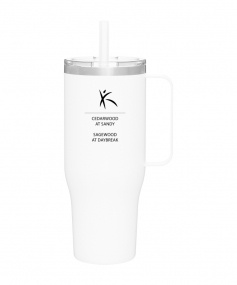 40 oz double wall 18/8 stainless steel thermal mug with copper vacuum insulation, stainless steel rim, dual-purpose push-on clear lid, matching sliding closure, flexible wide silicone straw, and powder coated finish. Individual gift box. Hand wash recommended. Do not microwave. Complies with FDA, Prop 65. 9.75" H x 4" W