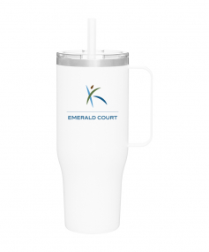 40 oz double wall 18/8 stainless steel thermal mug with copper vacuum insulation, stainless steel rim, dual-purpose push-on clear lid, matching sliding closure, flexible wide silicone straw, and powder coated finish. Individual gift box. Hand wash recommended. Do not microwave. Complies with FDA, Prop 65. 9.75" H x 4" W