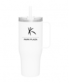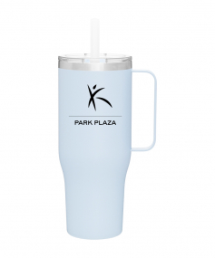 40 oz double wall 18/8 stainless steel thermal mug with copper vacuum insulation, stainless steel rim, dual-purpose push-on clear lid, matching sliding closure, flexible wide silicone straw, and powder coated finish. Individual gift box. Hand wash recommended. Do not microwave. Complies with FDA, Prop 65. 9.75" H x 4" W