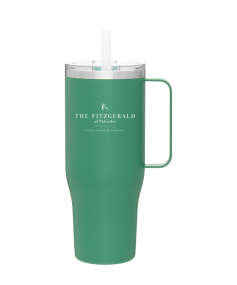 40 oz double wall 18/8 stainless steel thermal mug with copper vacuum insulation, stainless steel rim, dual-purpose push-on clear lid, matching sliding closure, flexible wide silicone straw, and powder coated finish. Individual gift box. Hand wash recommended. Do not microwave. Complies with FDA, Prop 65. 9.75" H x 4" W