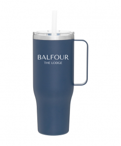 40 oz double wall 18/8 stainless steel thermal mug with copper vacuum insulation, stainless steel rim, dual-purpose push-on clear lid, matching sliding closure, flexible wide silicone straw, and powder coated finish. Individual gift box. Hand wash recommended. Do not microwave. Complies with FDA, Prop 65. 9.75" H x 4" W