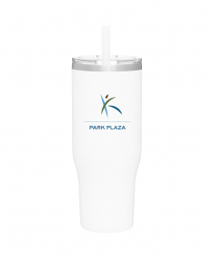 40 oz double wall 18/8 stainless steel thermal tumbler with copper vacuum insulation, stainless steel rim, dual-purpose push-on clear lid, matching sliding closure, flexible wide silicone straw, and powder coated finish