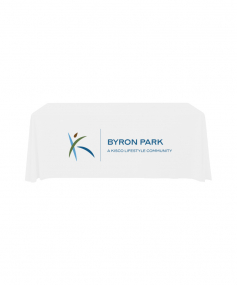 6' Standard PolyPoplin Throw style table cover with one color logo. Designed for quick and easy use while looking great. All corners are rounded meaning they will not gather and lay on the floor. Floor length on all 4 sides. Made from woven polyester. 72" L x 30" D x 29" H