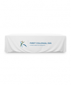 8 ft. Premium PolyKnit throw table cover with one color logo. Fits a 96 inch wide x 30 inch deep table. All corners are rounded meaning they will not gather and lay on the floor. Floor length on 4 sides. This cloth requires no ironing, is EasyCare machine washable and dryer safe.