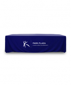 8 ft. Premium PolyKnit throw table cover with one color logo. Fits a 96 inch wide x 30 inch deep table. All corners are rounded meaning they will not gather and lay on the floor. Floor length on 4 sides. This cloth requires no ironing, is EasyCare machine washable and dryer safe.