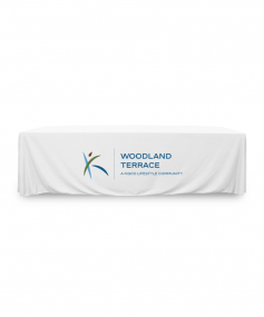 8 ft. Premium PolyKnit throw table cover with one color logo. Fits a 96 inch wide x 30 inch deep table. All corners are rounded meaning they will not gather and lay on the floor. Floor length on 4 sides. This cloth requires no ironing, is EasyCare machine washable and dryer safe.