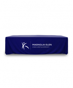 8 ft. Premium PolyKnit throw table cover with one color logo. Fits a 96 inch wide x 30 inch deep table. All corners are rounded meaning they will not gather and lay on the floor. Floor length on 4 sides. This cloth requires no ironing, is EasyCare machine washable and dryer safe.