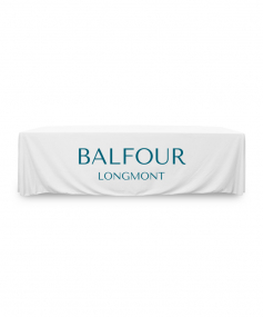 8 ft. Premium PolyKnit throw table cover with one color logo. Fits a 96 inch wide x 30 inch deep table. All corners are rounded meaning they will not gather and lay on the floor. Floor length on 4 sides. This cloth requires no ironing, is EasyCare machine washable and dryer safe.