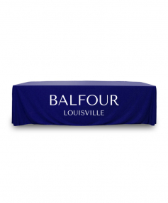 8 ft. Premium PolyKnit throw table cover with one color logo. Fits a 96 inch wide x 30 inch deep table. All corners are rounded meaning they will not gather and lay on the floor. Floor length on 4 sides. This cloth requires no ironing, is EasyCare machine washable and dryer safe.