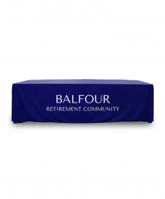 8 ft. Premium PolyKnit throw table cover with one color logo. Fits a 96 inch wide x 30 inch deep table. All corners are rounded meaning they will not gather and lay on the floor. Floor length on 4 sides. This cloth requires no ironing, is EasyCare machine washable and dryer safe.
