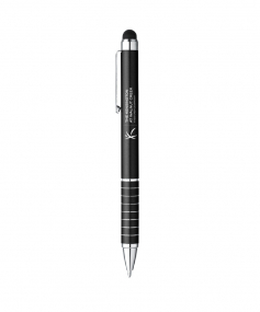 Aluminum Twist Action Ballpoint; Bold Enamel Color Finish; Shiny Silver Top, Clip, Pen Tip And Decorative Multiple Band Accents; Capacitive Soft Rubber Stylus Keeps Your Screen, Fingerprint Free! Comes With Black Ink. Complies with Prop 65. 2 1/4" W