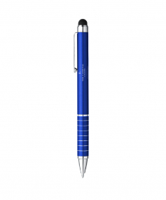Aluminum Twist Action Ballpoint; Bold Enamel Color Finish; Shiny Silver Top, Clip, Pen Tip And Decorative Multiple Band Accents; Capacitive Soft Rubber Stylus Keeps Your Screen, Fingerprint Free! Comes With Black Ink. Complies with Prop 65. 2 1/4" W
