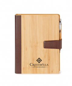 Bamboo and vinyl trim journal cover with vinyl lining, matching pen loop (pen not included) and a refillable spiral bound ECO journal containing 200 ivory lined pages. Bamboo is a natural fiber. 9 1/4" H x 7 1/16" W x 1 1/4" thick.